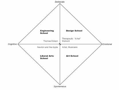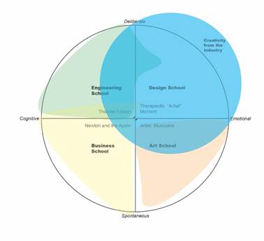 The four quadrants of creativity can also be categorized and matched up with the educational specializations currently offered inside of a university environment. Hypothetically speaking, engineering school represents the combination of deliberate and cognitive creativity, design school uses a deliberate and emotional type of creativity. While students from business school use cognitive and spontaneous creativity in their process, art students tend to use their spontaneous and emotional creativity when creating artworks.