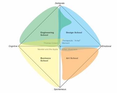 The four quadrants of creativity can also be categorized and matched up with the educational specializations currently offered inside of a university environment. Hypothetically speaking, engineering school represents the combination of deliberate and cognitive creativity, design school uses a deliberate and emotional type of creativity. While students from business school use cognitive and spontaneous creativity in their process, art students tend to use their spontaneous and emotional creativity when creating artworks.