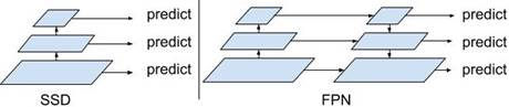 SSD algorithm does not perform upsampling and only extracts features of different sizes at different layers for prediction without adding extra calculations as shown in Fig.2 [3]. But, there are different sized targets in the image, while different targets have different features. Simple features can be distinguished by using the features of shallow layers. And the features of deep layers can be used to distinguish complex targets. FPN is characterized by the simultaneous use of shallow and deep features to better identify targets [4].