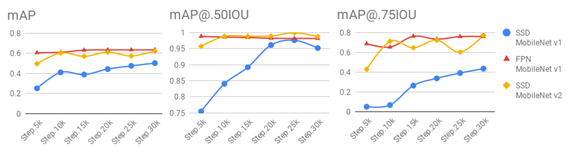 As shown in the Fig.4, when the IOU is 0.5, the mAP of the SSD MobileNet v2 model is close to 1. And the mAP of SSD MobileNet v2 is better than the other two models. When the IOU is 0.75, the mAP of SSD MobileNet v2 is not as good as the mAP of the FPN MobileNet v1 model. The performance of the FPN MobileNet v1 model is best considering the different IOU situations.